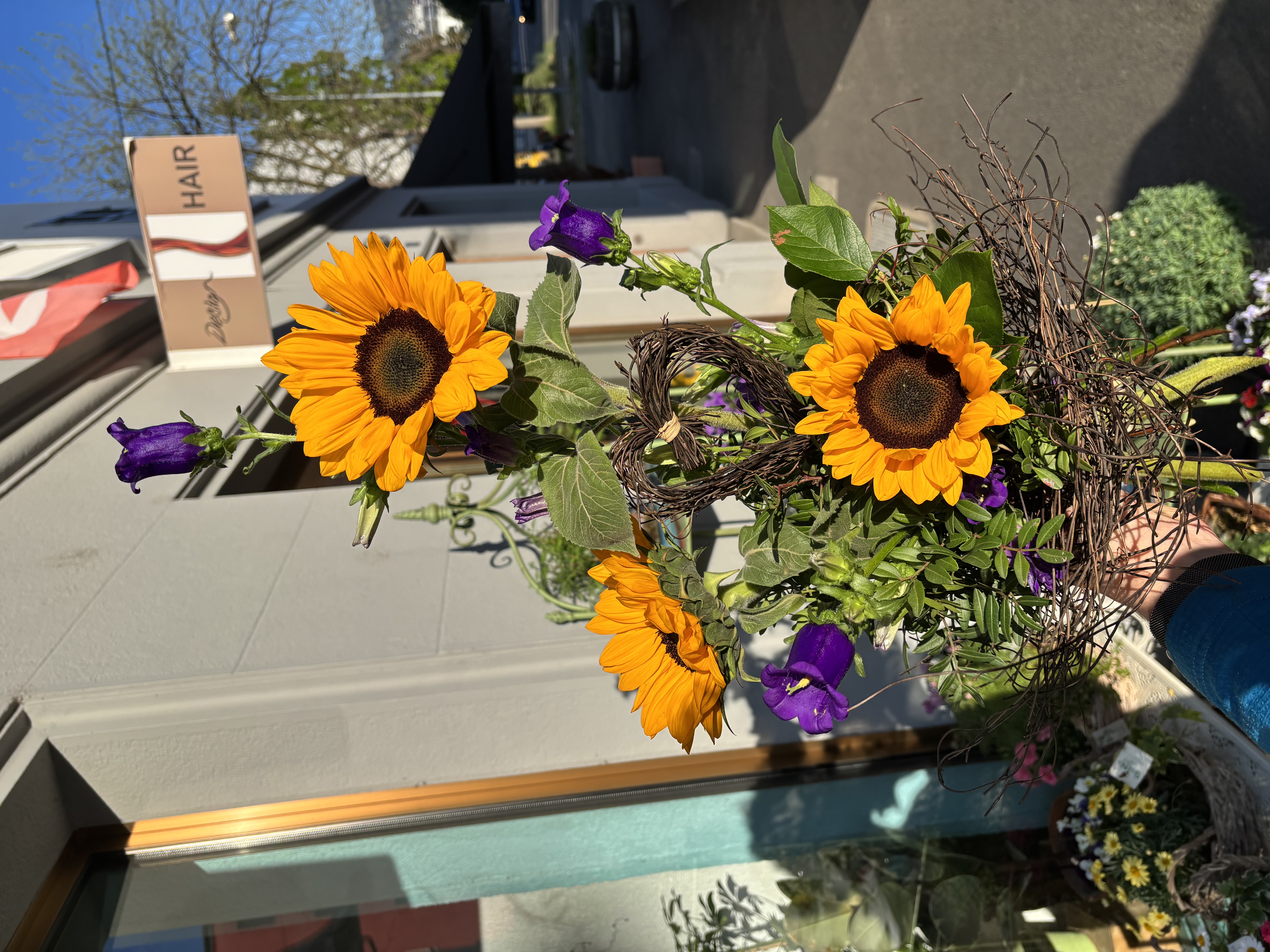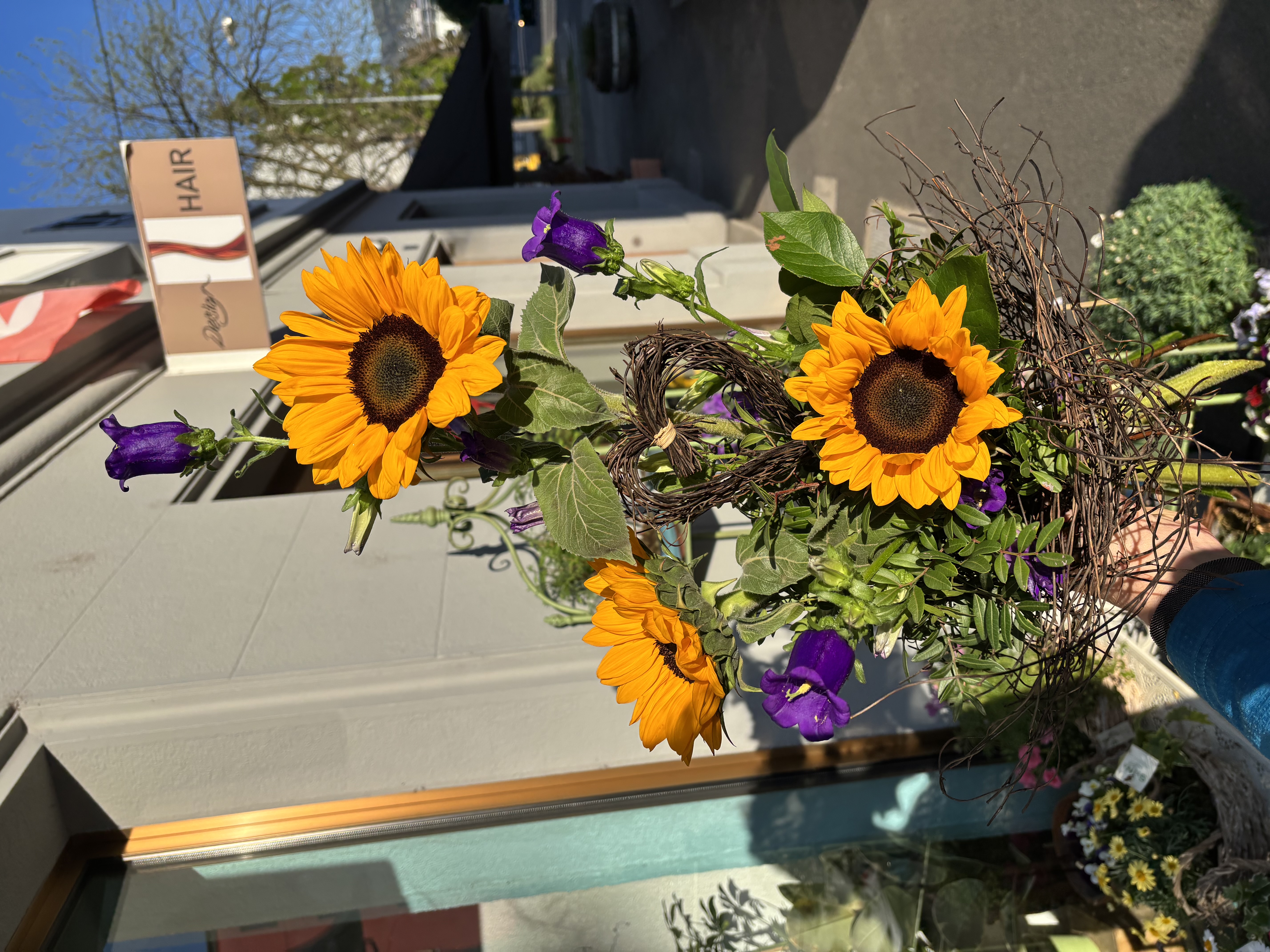 Bouquet composé de tournesols et campanules garni d'un coeur en sisal