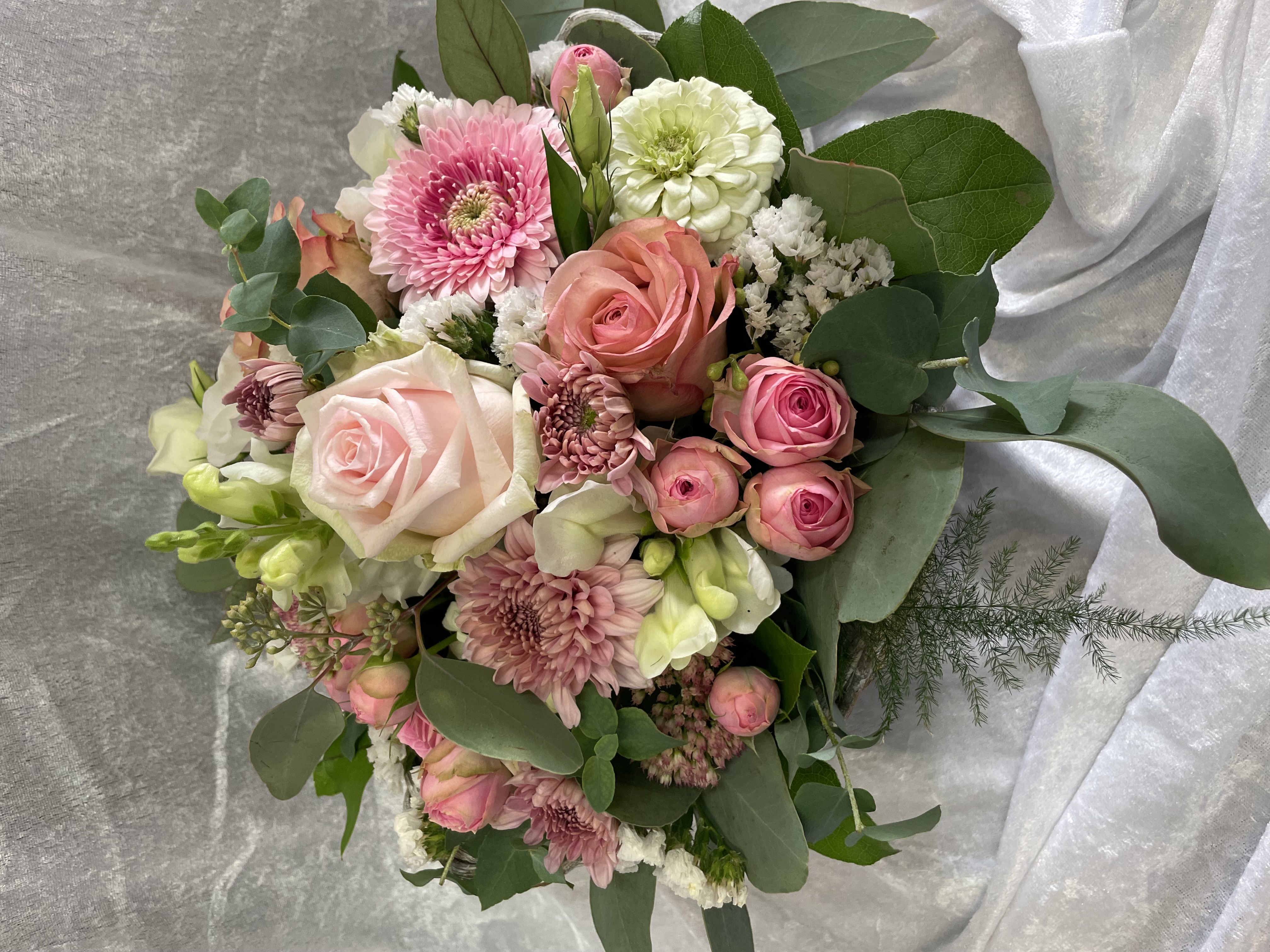Panier de fleurs coupées dans les tons pastel . La couleur et la variété des roses et germinis dépend de l'arrivage du jour.