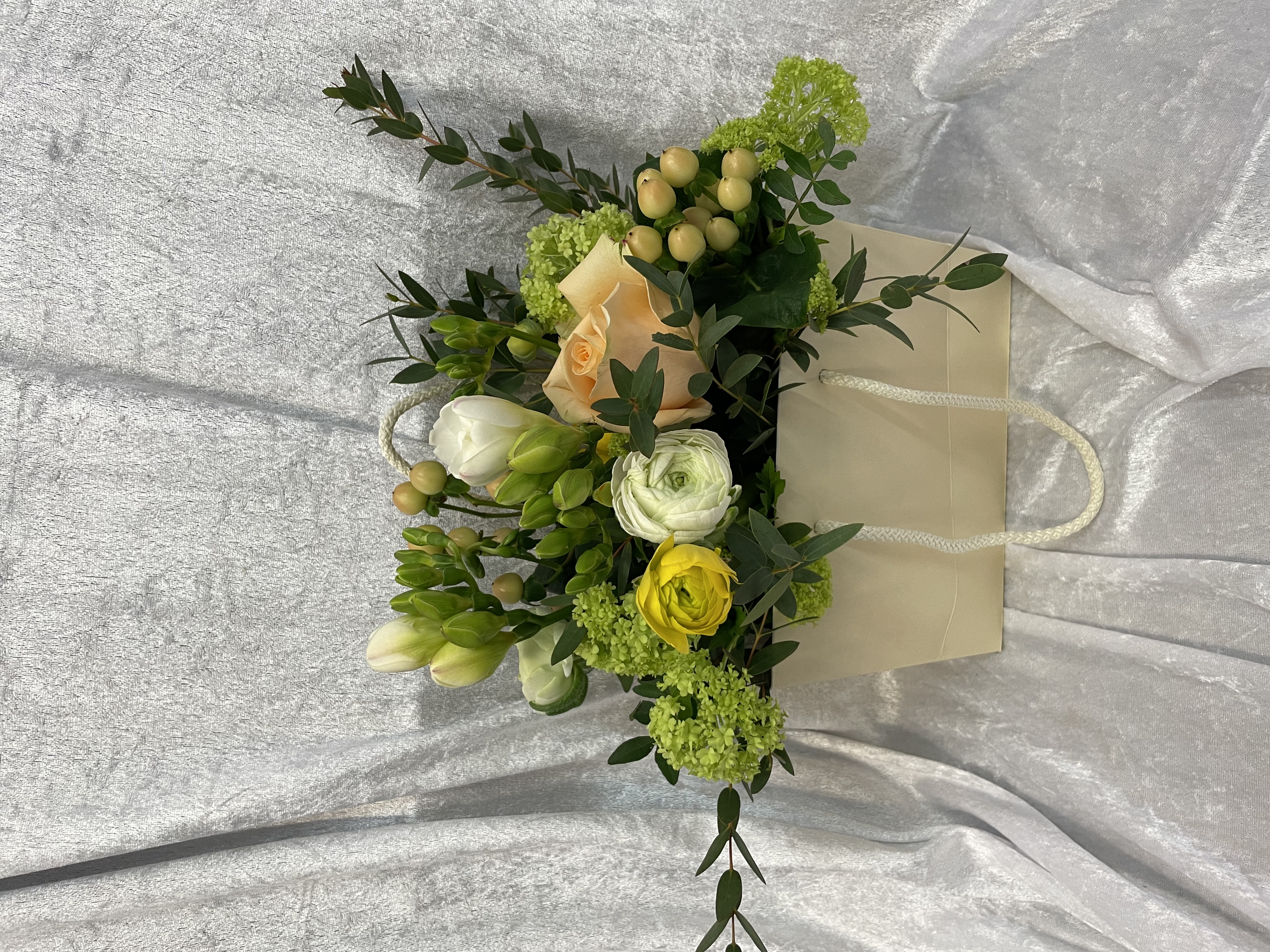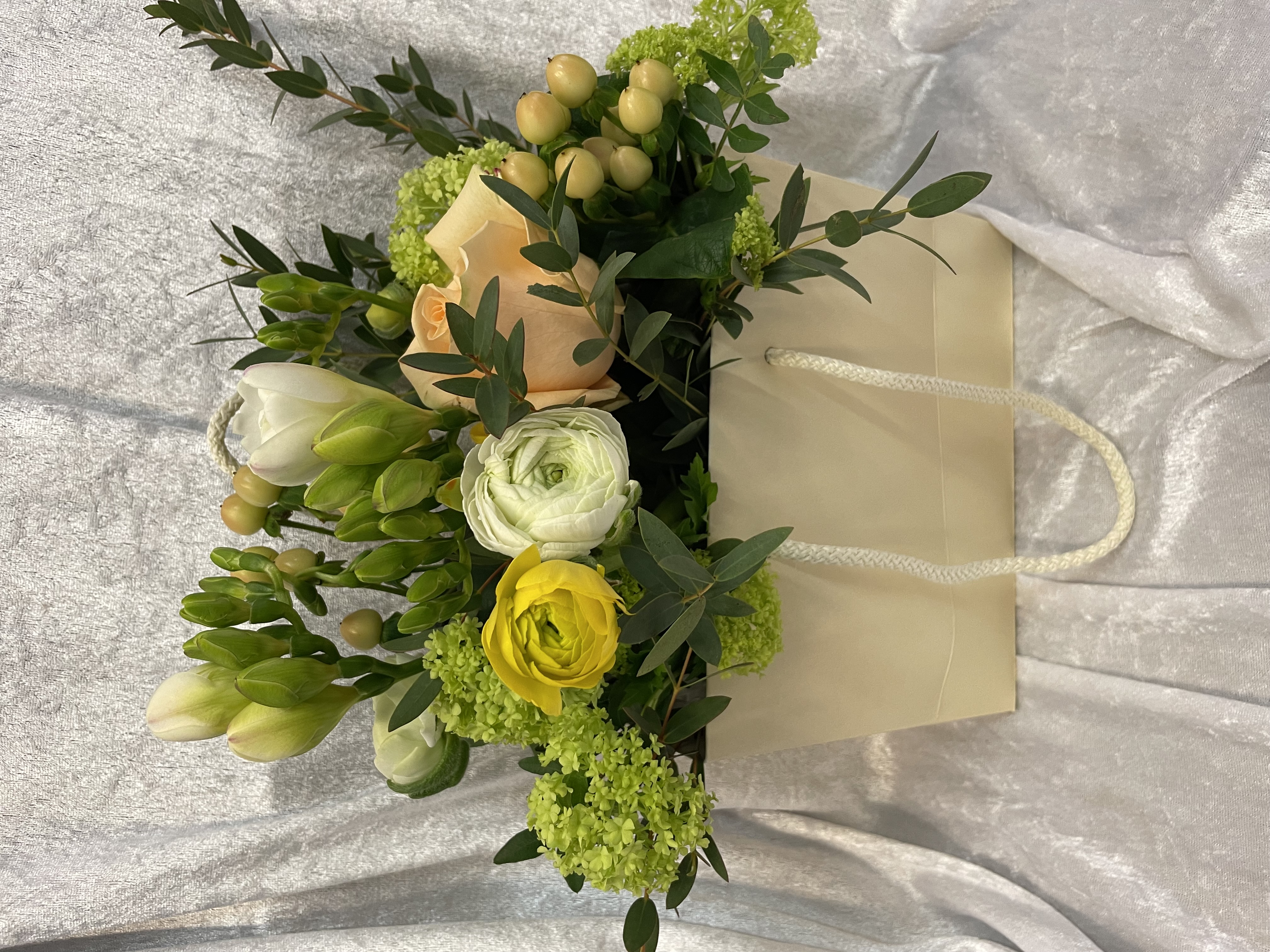 Petit sac de couleur crème garni de fleurs dans les tons blanc, jaune saumon. Les fleurs varient suivant les arrivages