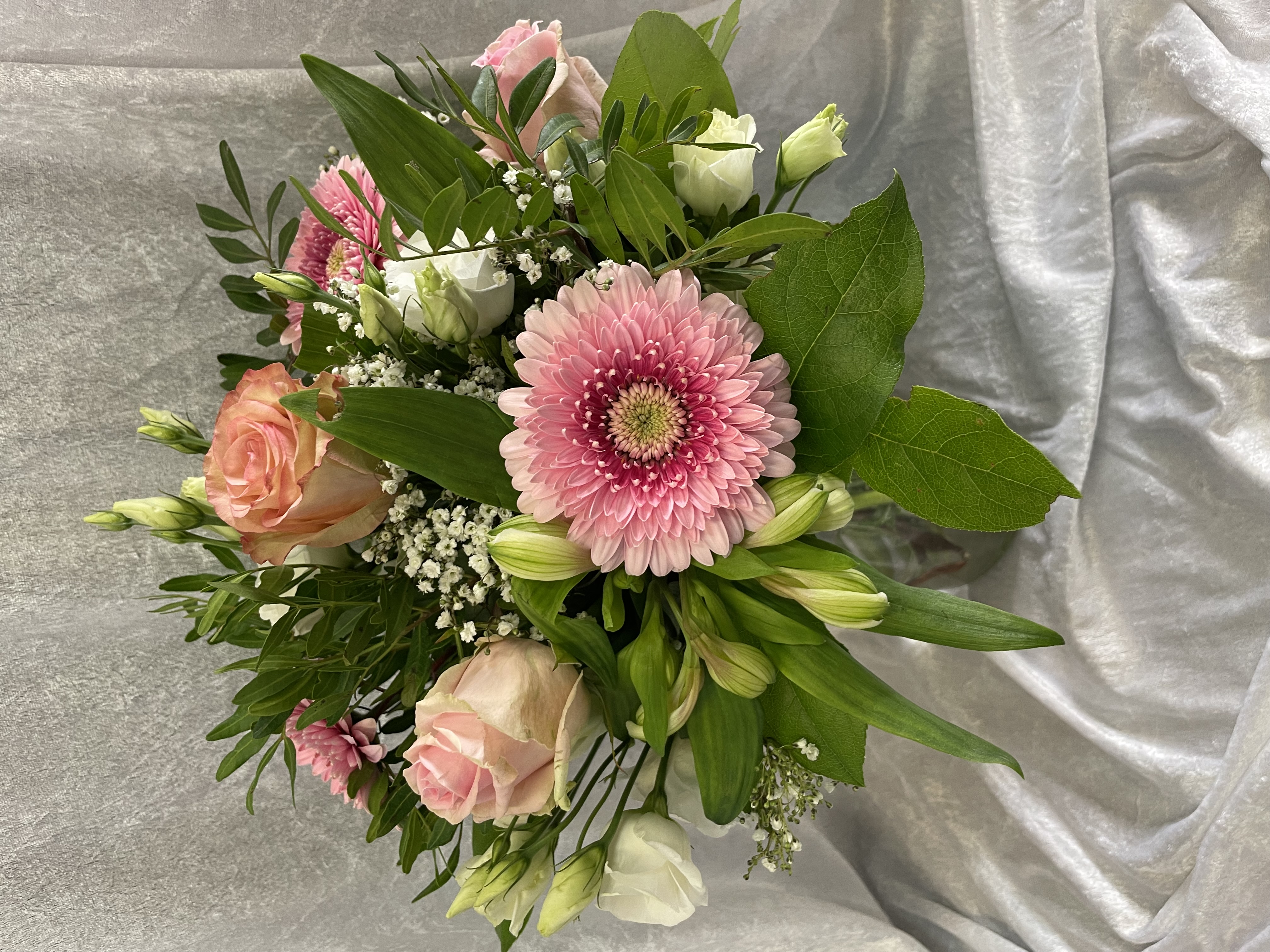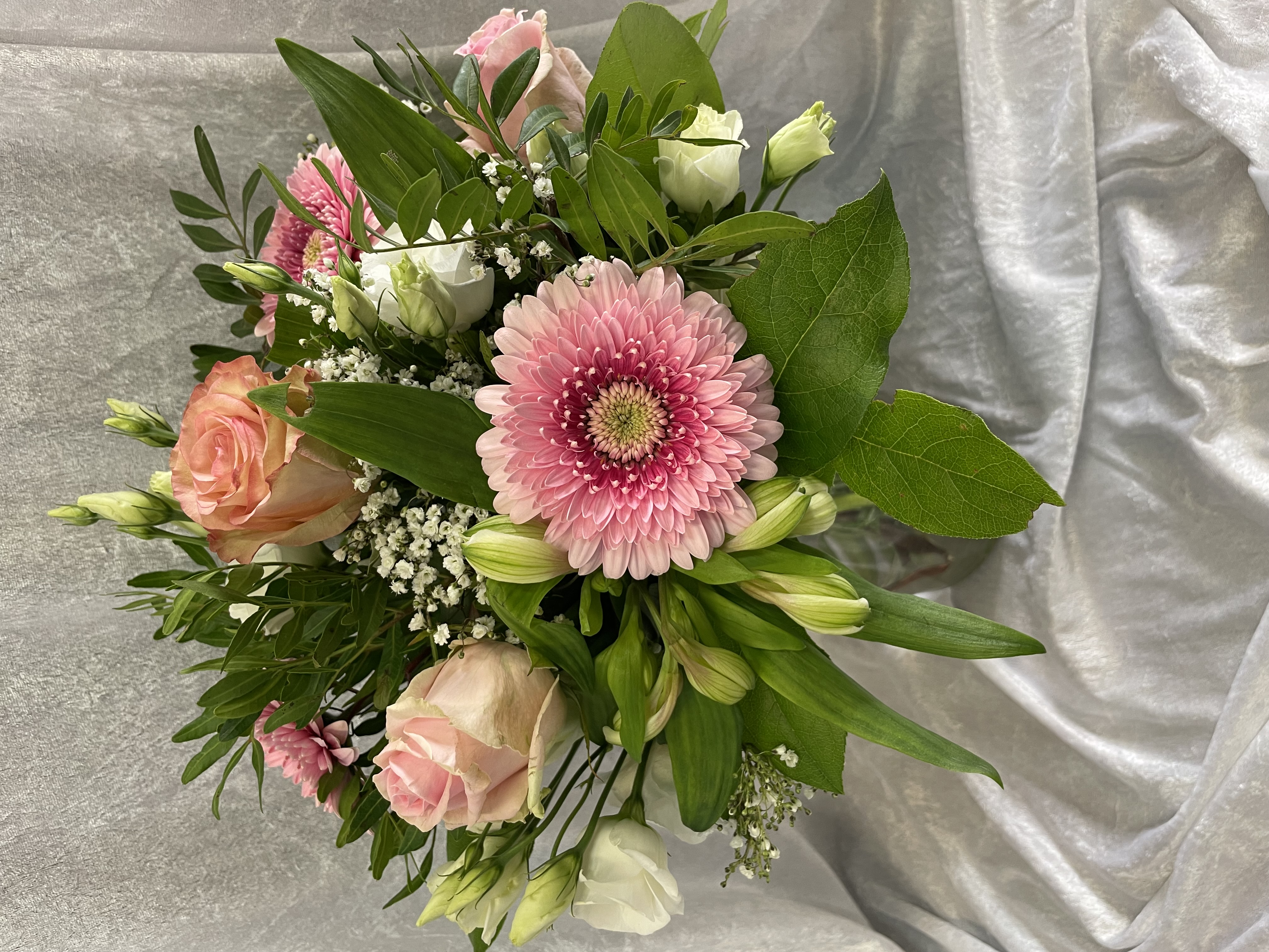 Bouquet rond dans les tons pastel composé de roses, lisianthus, gemini,alstromeira et diverses verdures de décoration.