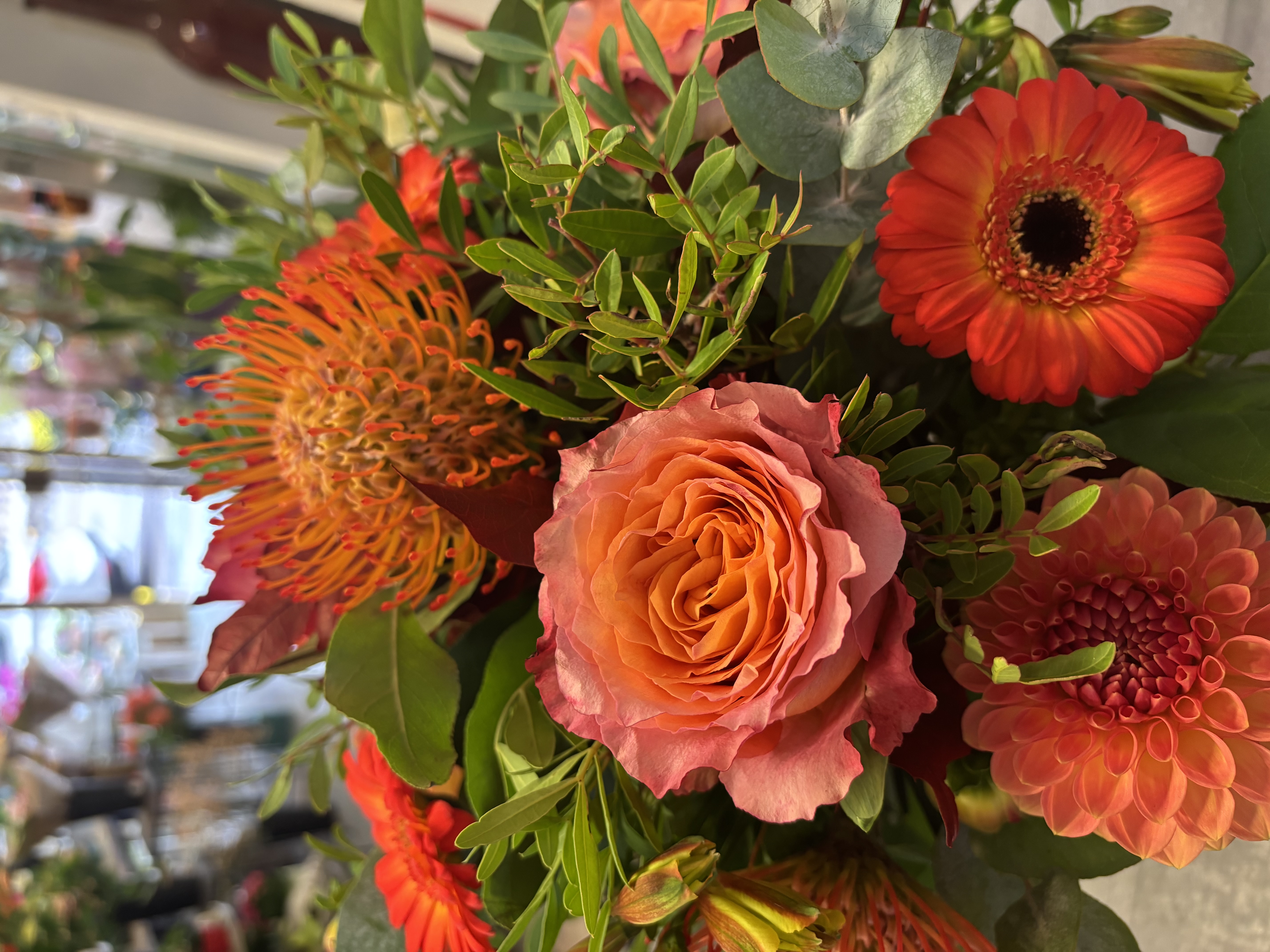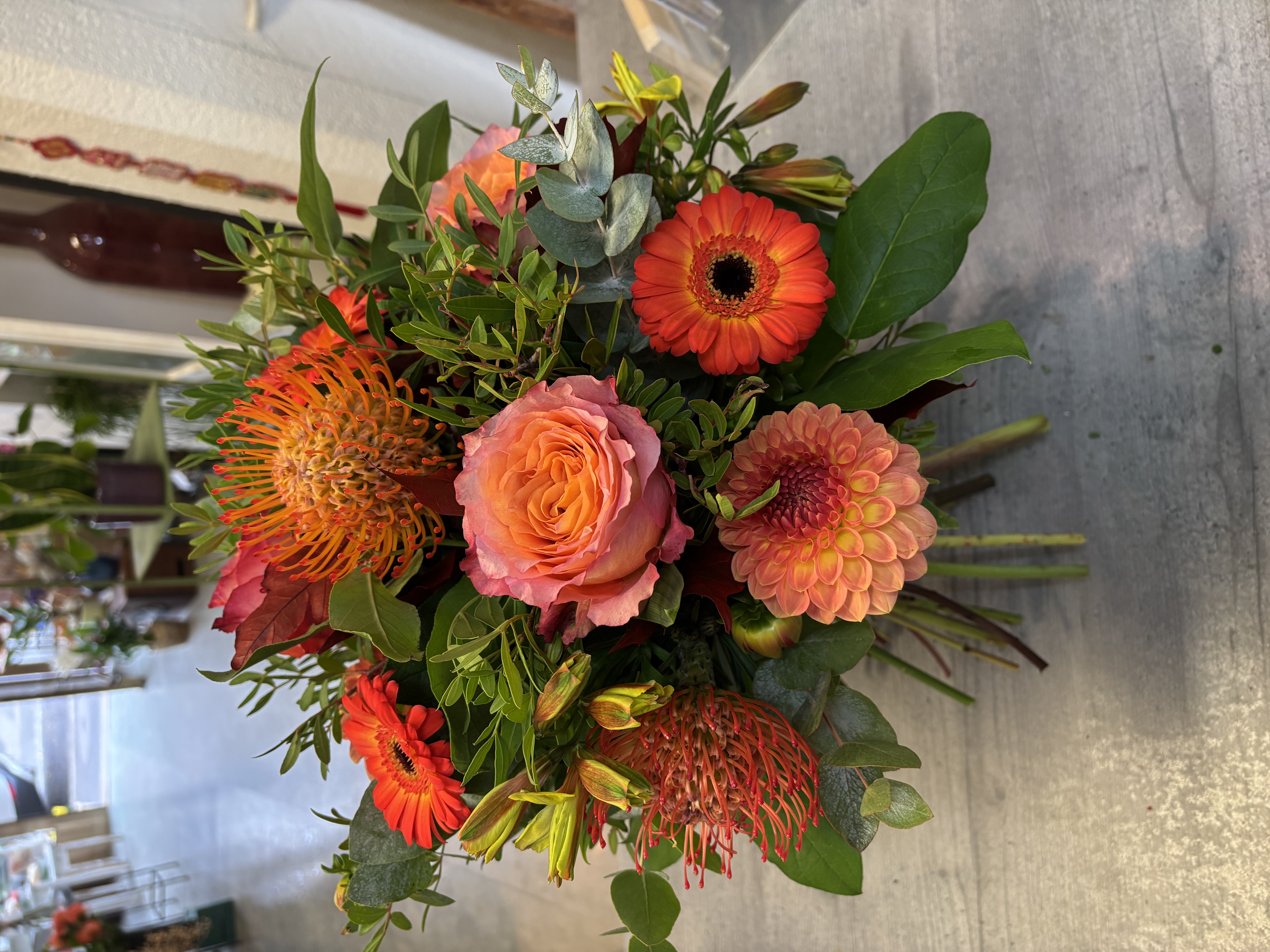 Bouquet dans les tons chauds orange .rouge avec des fleurs de saison