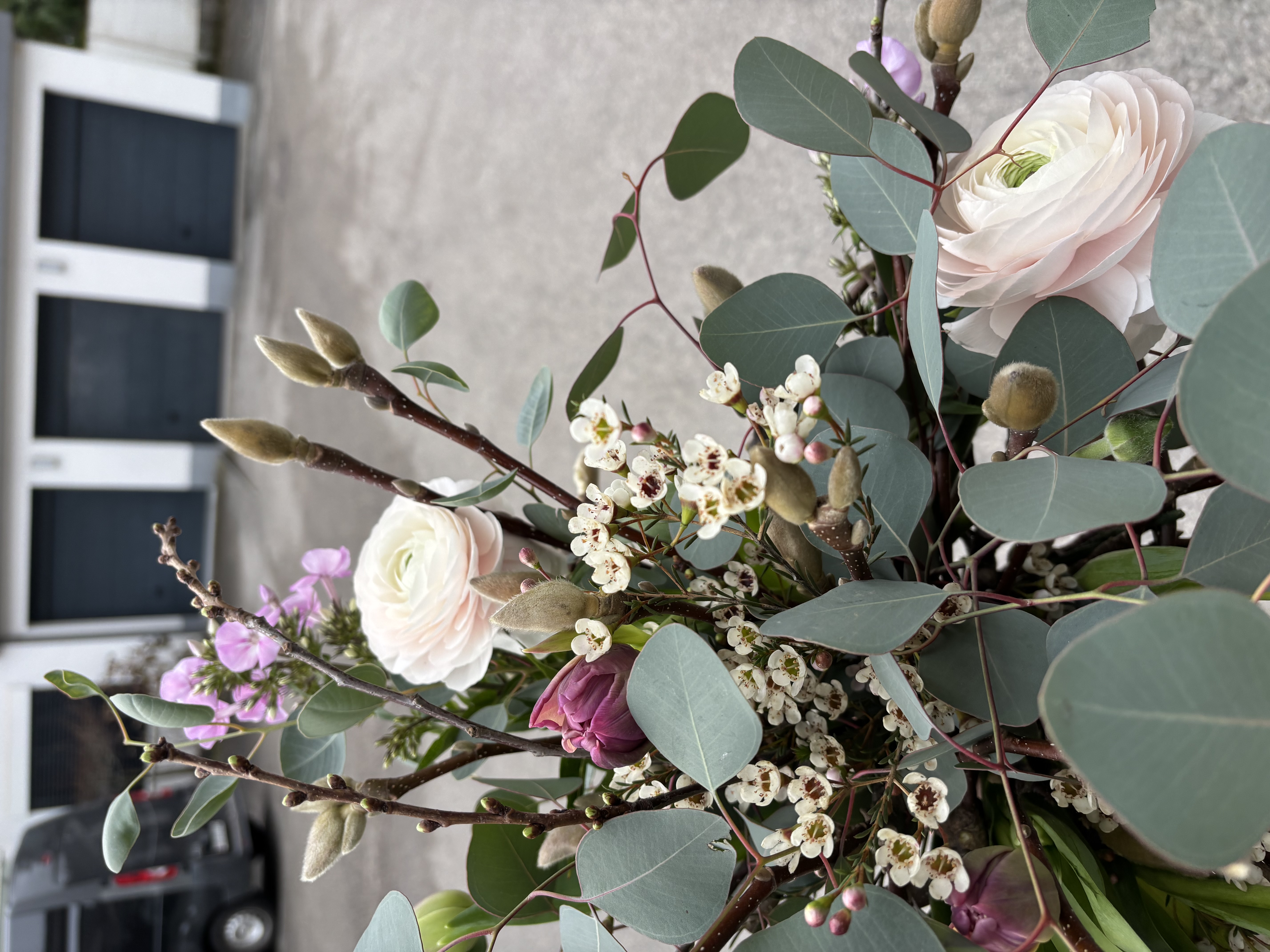 Bouquet dans une structure en forme de coeur , composé de tulipes renoncules, magnolia